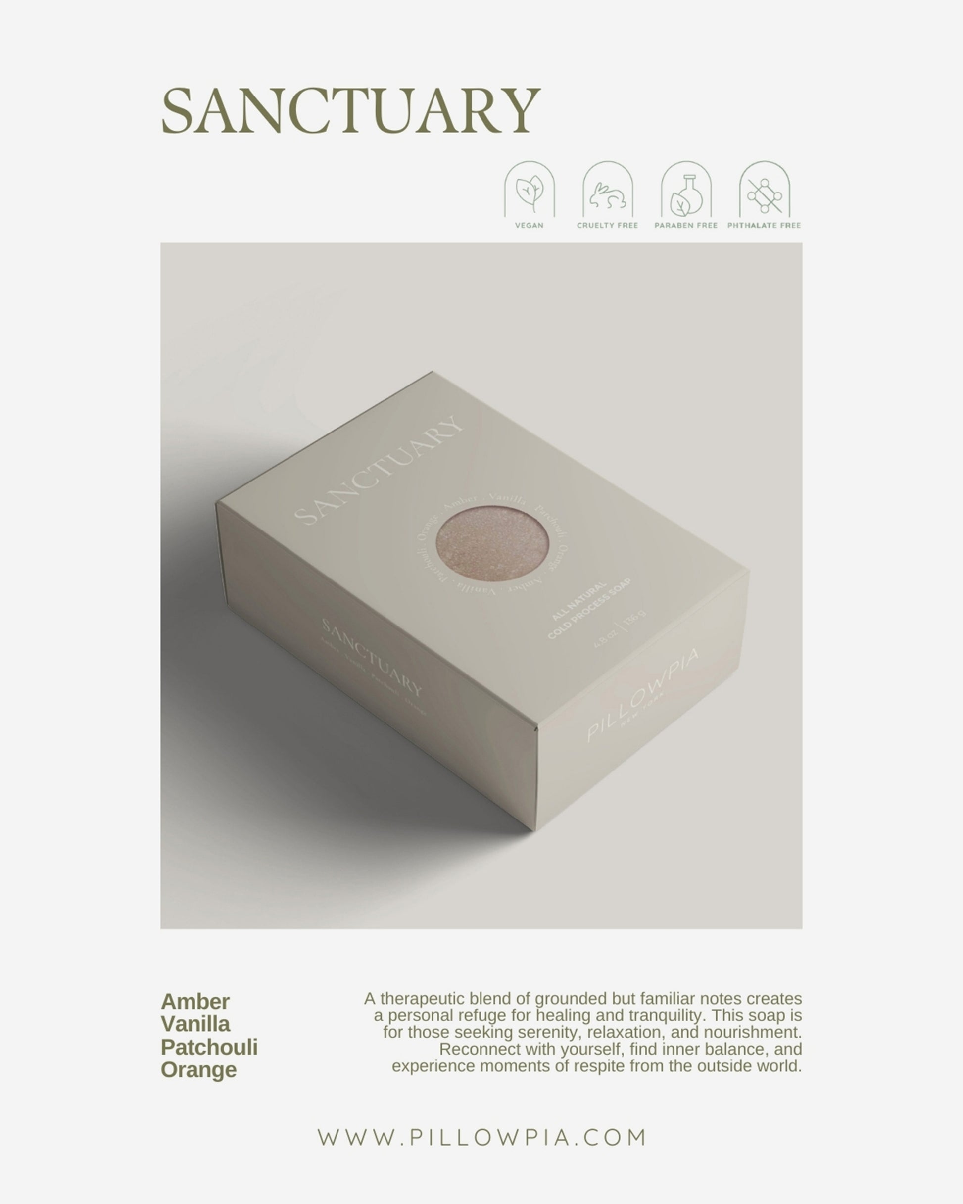 Sanctuary, with its therapeutic blend of grounding amber and patchouli notes combined with fragrant, familiar vanilla and orange, creates a personal refuge, a safe haven for healing and tranquility. This rich, natural soap is for those seeking serenity, relaxation, and nourishment. Reconnect with yourself, find inner balance, and experience moments of respite from the outside world.