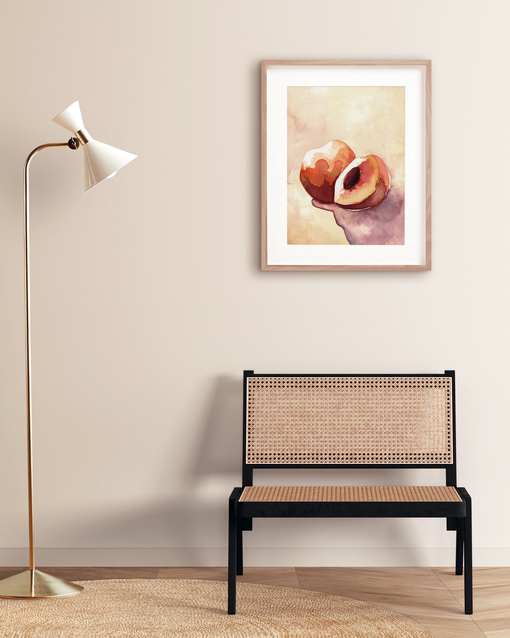 Feel peachy all the time with this wall art piece that channels Pantone's 2024 color of the year, 'peach fuzz,' in a juicy watercolor rendition. Perfect for a modern or traditional home, it serves as ideal artwork for the living room, kitchen, or bedroom—a must-have for the stone fruit lover's abode.